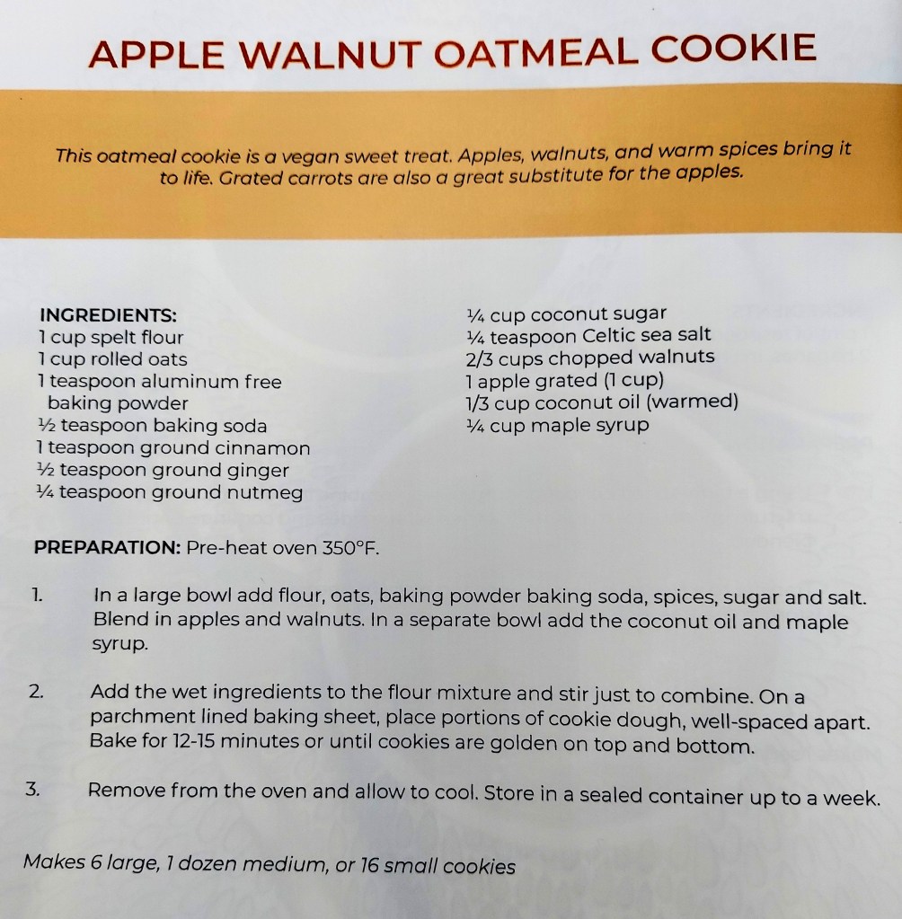 The Apple Walnut Oatmeal Cookie is one of only five desserts in the cookbook. It is the last recipe and can be found on page 232 . It is a sweet treat!